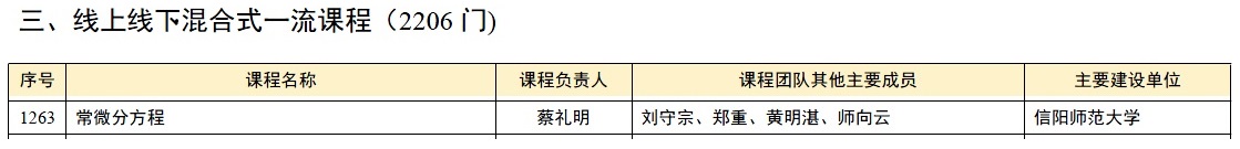 近日,教育部正式公布了第三批国家级一流本科课程认定结果公示名单,永利23411集团蔡礼明教授作为负责人的《常微分方程》课程入选线上线下混合式一流课程