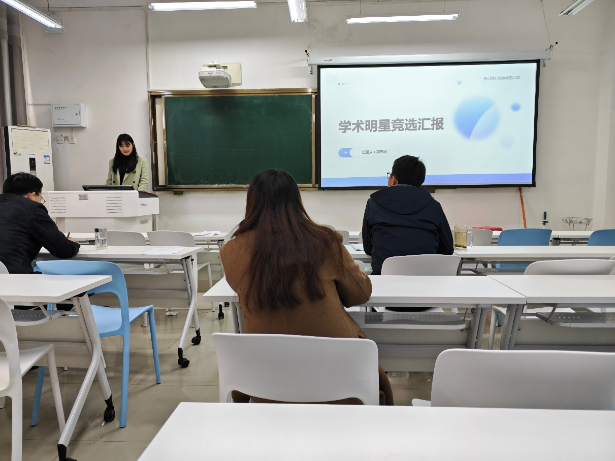 学术明星展风采。11月26日,公司在数学楼501举办“学术明星”评选,来自公司的10名员工参加竞选,曾凡奇、孙兰银两位老师担任评委。参评选手主要围绕学术成果、社会实践、获奖情况等方面进行展示,充分体现出公司研究生求是扎实的科研能力和积极向上的学习状态。最终郑紫涵和常慧婷两名同学被推荐到公司参加比赛。