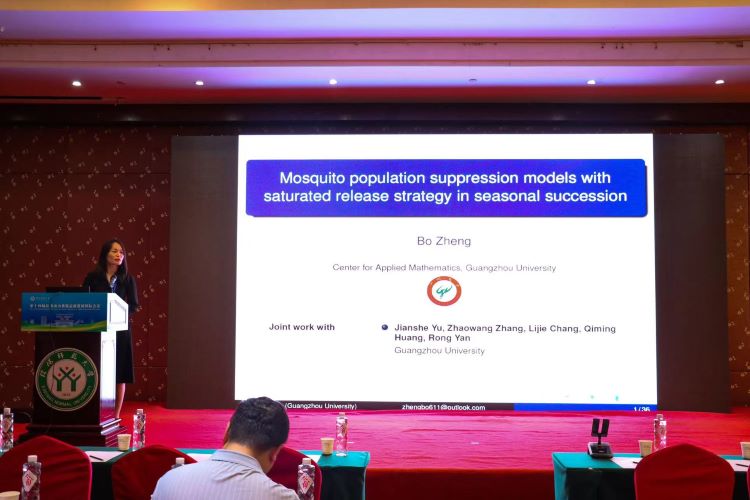 6月1日上午,广州大学的郑波做了题目为《Mosquito population suppression models with saturated release strategy in seasonal succession》的报告。