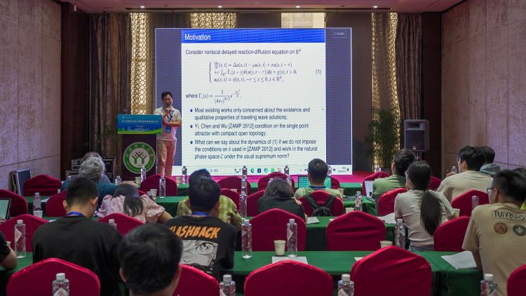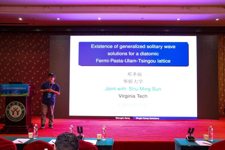 华侨大学的邓圣福做了题目为《Existence of generalized solitary waves for a diatomic Fermi-Pasta-Ulam-Tsingou lattice》的报告。