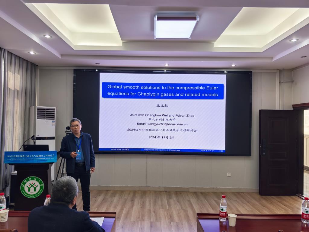 1场报告由华北水利水电大学的王玉柱教授作了题目为《Global smooth solutions to the compressible Euler equations for Chaplygin gases and related models》的学术报告。