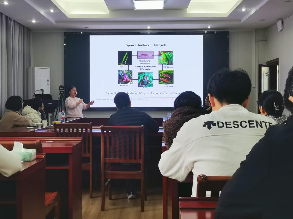 11月10日上午,应永利23411集团邀请,陕西师范大学舒洪英教授在数学楼315会议室为公司师生作了题为“Spatiotemporal dynamics of a structured spruce budworm diffusive model”的学术报告。报告由副经理王霞教授主持,生物数学方向的老师及研究生聆听了此次报告。