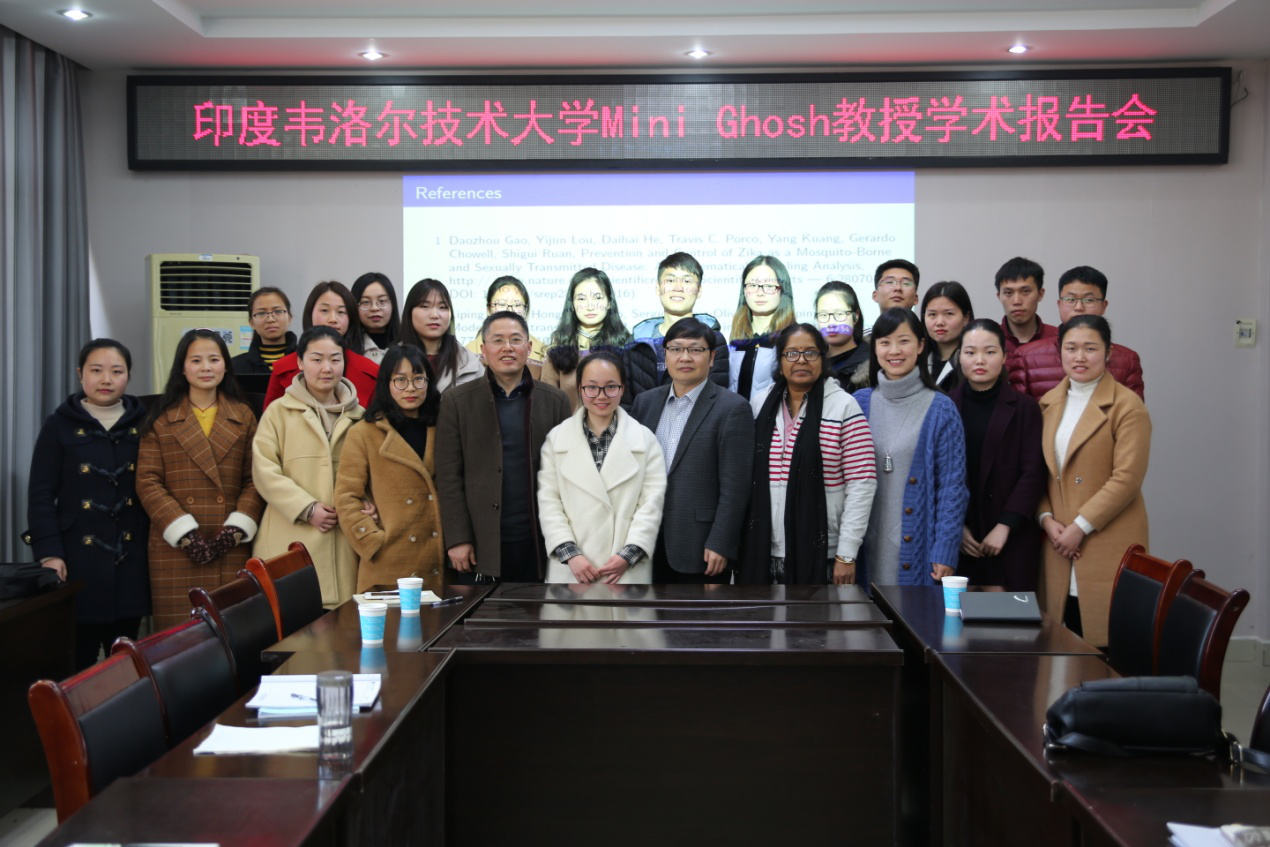 2018年3月10日下午,应永利23411集团邀请,印度韦洛尔技术大学(Vellore Institute of Technology)数学系教授Mini Ghosh来公司讲学和开展合作研究, 并在数学与统计公司学术报告厅作了题为“Mathematical Modelling of Zika Virus Disease”的学术报告。报告会由永利23411集团副经理蔡礼明教授主持,河南师范大学副董事长李学志教授和该院部分教师及研究生聆听了此次报告。
