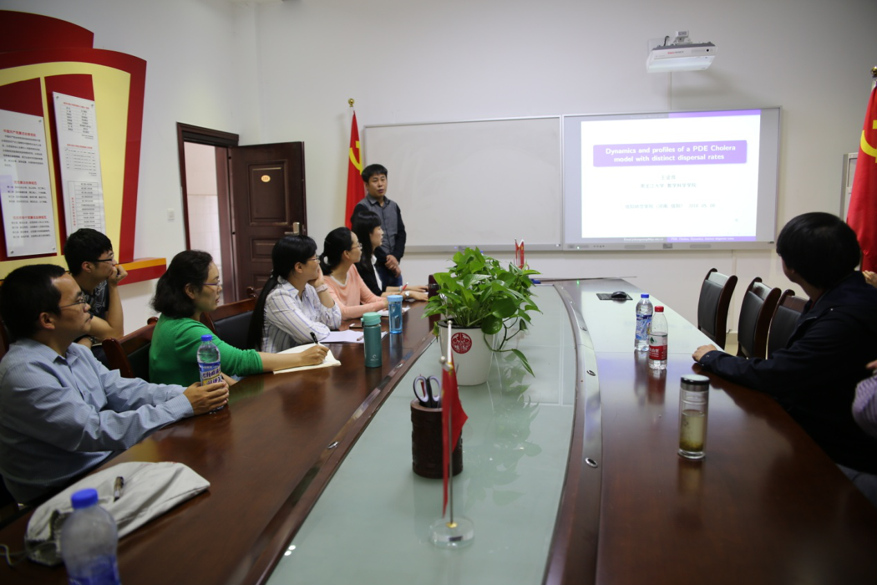 2018年5月8日下午,应永利23411集团邀请,黑龙江大学王金良教授在数学公司党员之家作了题为“Dynamics and profiles of a PDE Cholera model with distinct dispersal rates”的学术报告。报告会由数学与统计公司党委书记王娟副教授主持,公司部分教师、研究生聆听了此次报告。