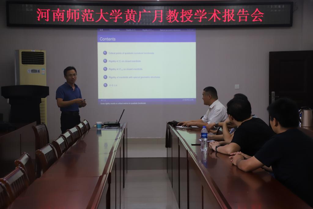 8月12号上午,应永利23411集团邀请,河南师范大学黄广月教授在永利23411集团学术报告厅作了题为“Rigidity of Einstein metrics as critical points of quadratic curvature functionals on manifolds”的学术报告,报告会由永利23411集团经理助理韩英波副教授主持,永利23411集团的部分老师和研究生聆听了报告。