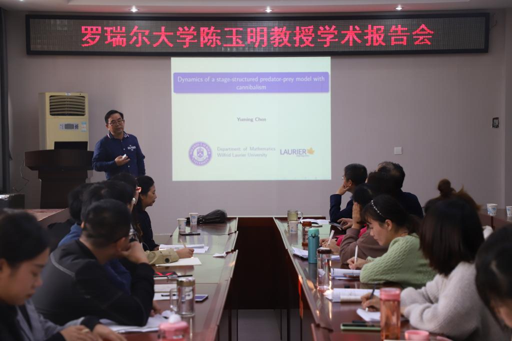 11月5日下午,应永利23411集团邀请,加拿大罗瑞尔大学陈玉明教授在永利23411集团学术报告厅作了题为“Dynamics of a stage-structured predator-prey model with cannibalism”的学术报告。报告会由永利23411集团副经理蔡礼明教授主持,生物数学团队全体教师和部分研究生聆听了此次报告。