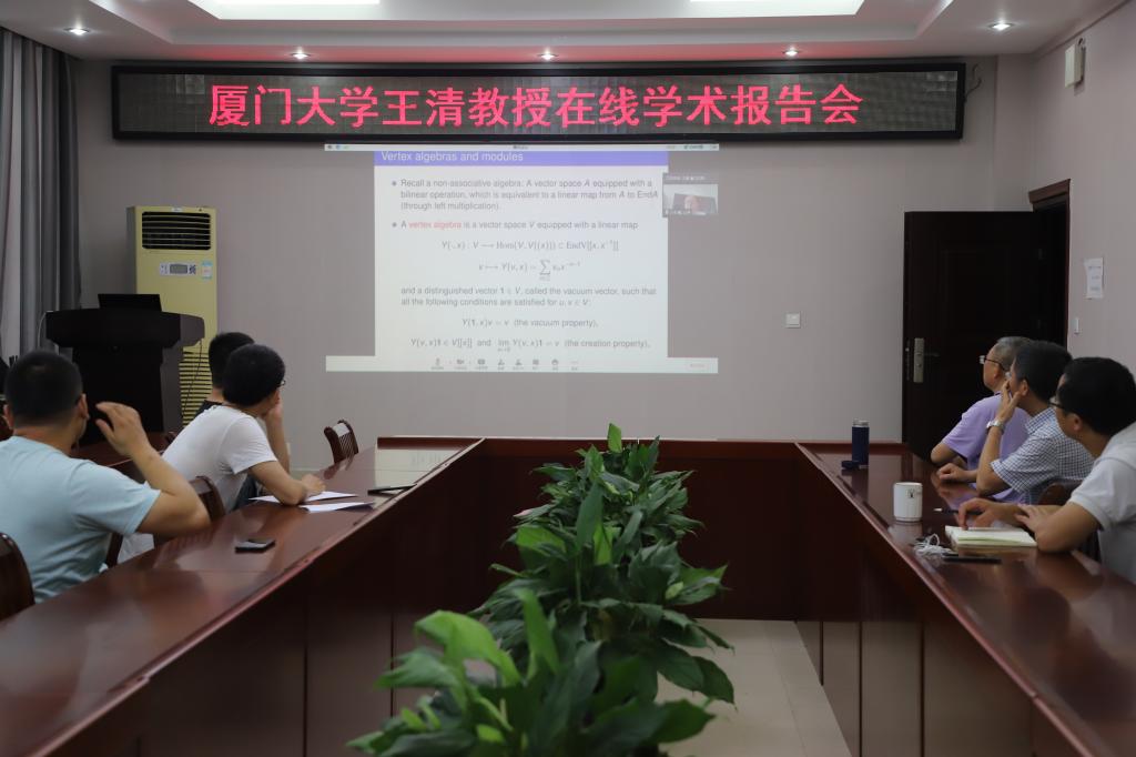 在报告中,王清老师首先介绍了如何通过 local system 理论来构造顶点代数;其次,阐述通过该理论所得到的仿射顶点代数,并且说明了仿射顶点代数的模与仿射 Kac-Moody 代数的限制模存在一一对应关系;最后,王教授通过伽马-local 理论,构造了与该三角李代数相关的伽马-顶点代数。报告结束后,王清教授一一回答了师生提出的问题,与大家进行了深入的交流互动,并提出对顶点代数未来研究方向的看法与建议。