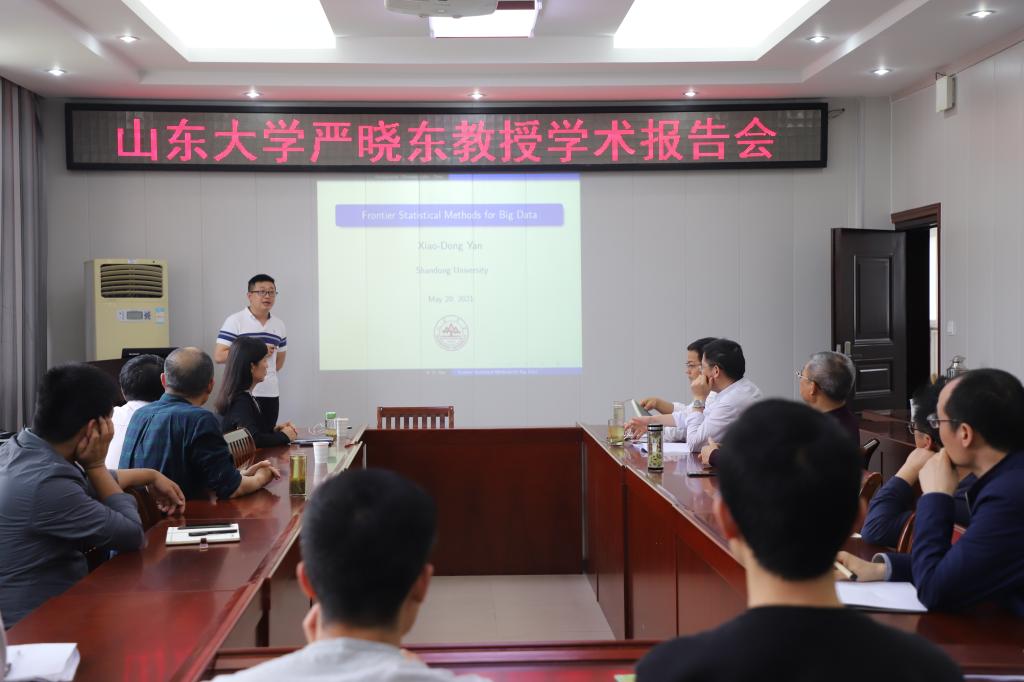 5月21日下午,应永利23411集团邀请,山东大学严晓东教授在永利23411集团学术报告厅做了一场题为《大数据统计学前沿方法介绍》的学术报告。报告会由永利23411集团副经理蔡礼明主持,公司经理胡余旺、书记王娟、副经理陈越奋和部分老师、研究生聆听了此次报告。