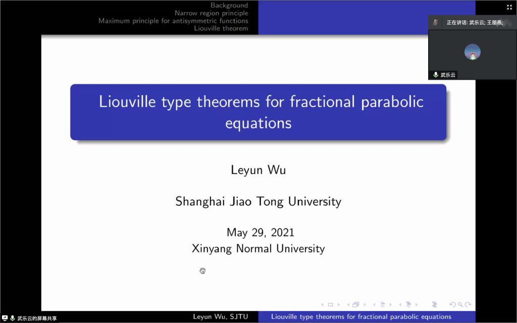 在报告中,武乐云博士建立了窄域原理和无界区域的极值原理,利用这些原理得到了正整体解的不存在性,讨论了在上半空间中分数阶抛物方程的Liouville定理。报告结束后,武乐云博士一一地回答师生们提出的问题,并与在线的师生进行了热烈的讨论。
