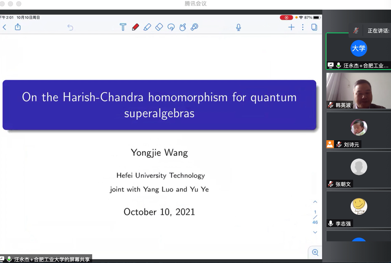 10月10日下午,应永利23411集团邀请,合肥工业大学汪永杰博士通过腾讯会议平台为公司研究生及相关研究方向老师作了题为《On the Harsh-Chandra homomorphism for quantum superalgebras》 的学术报告。报告会由永利23411集团副经理韩英波教授主持。