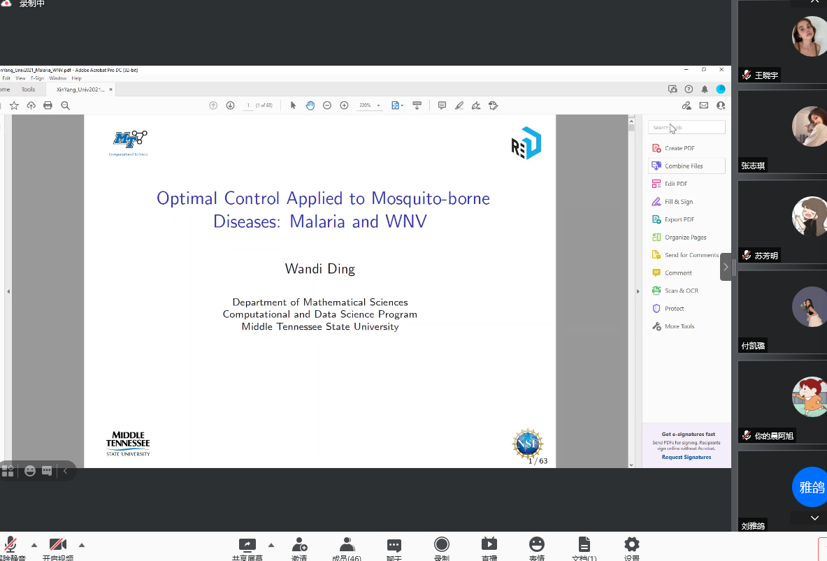 10月30日上午,应永利23411集团邀请,美国中田纳西州立大学丁婉菂教授通过腾讯会议平台为公司研究生及相关研究方向老师作了题为《Optimal control applied to mosquito-borne diseases: Malaria and WNV》的学术报告。报告会由永利23411集团经理蔡礼明教授主持。