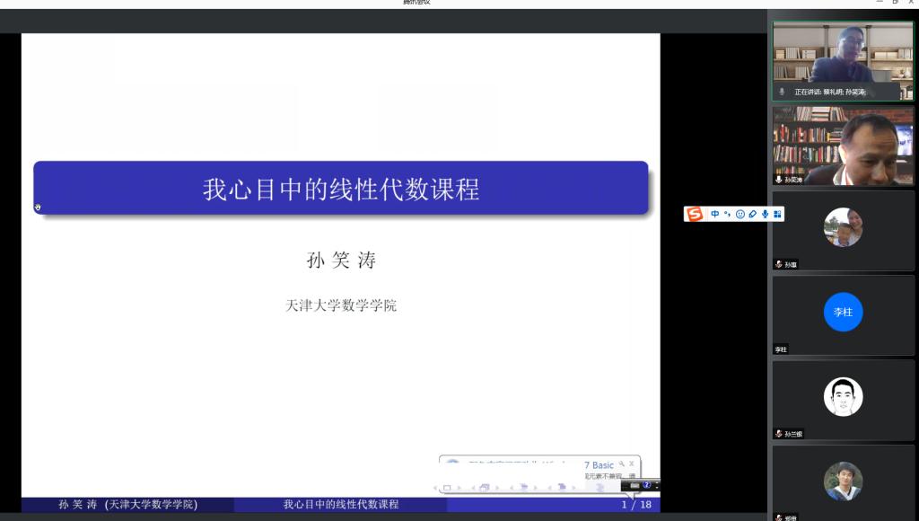 12月17日,应永利23411集团邀请,天津大学孙笑涛教授通过腾讯会议平台在线作了一场题为《我心目中的线性代数课程》的学术报告。公司部分教师和研究生聆听了此次报告。报告会由永利23411集团经理蔡礼明教授主持。