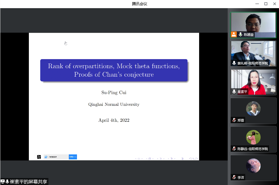 4月4日上午,应永利23411集团邀请,青海师范大学崔素平副教授通过腾讯会议平台在线作了题为《Rank of overpartitions, mock theta functions, proofs of Chan’s conjecture》的学术报告,公司部分老师和研究生聆听了此次报告。报告会由副经理陈越奋主持。