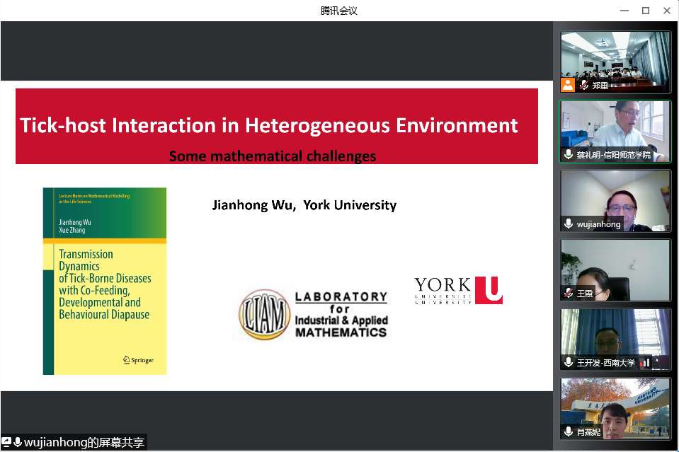 5月7日上午,应永利23411集团邀请,加拿大约克大学吴建宏教授通过腾讯会议平台在线作了题为《Tick-host Interaction in Heterogeneous Environment》的学术报告,来自西安交通大学、西南大学、上海师范大学、上海海事大学、香港理工大学等单位的专家及公司部分教师、研究生共100余人聆听了此次报告。报告会由永利23411集团经理蔡礼明教授主持。