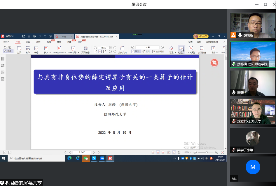 5月19日下午,应永利23411集团邀请,新疆大学周疆教授通过腾讯会议平台在线作了题为《Two-weight norm inequalities for some fractional type operators related to Schrödinger operator on weighted Morrey spaces》的学术报告,报告会由永利23411集团经理蔡礼明教授主持,公司部分老师、研究生和该领域相关博士聆听了此次报告。