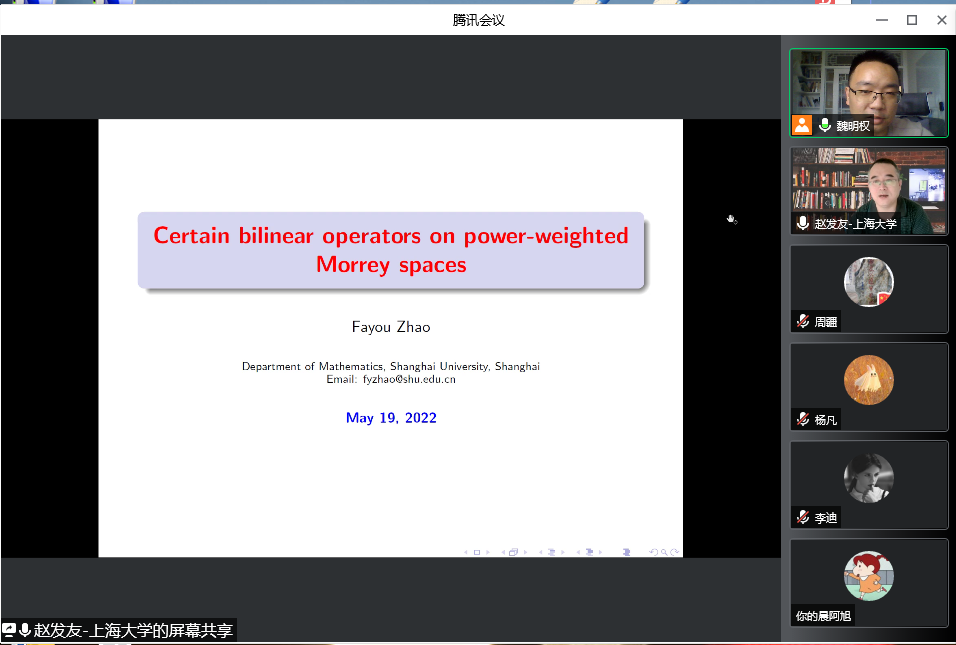 5月19日下午,应永利23411集团邀请,上海大学赵发友教授通过腾讯会议平台在线作了题为《Certain bilinear operators on power-weighted Morrey spaces》的学术报告,报告会由永利23411集团经理蔡礼明教授主持,公司部分老师、研究生和该领域相关博士聆听了此次报告。