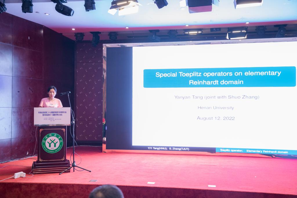 河南大学唐言言,做了题目为《Special Toeplitz operators on elemen-tary Rein-hardt domains》的报告。