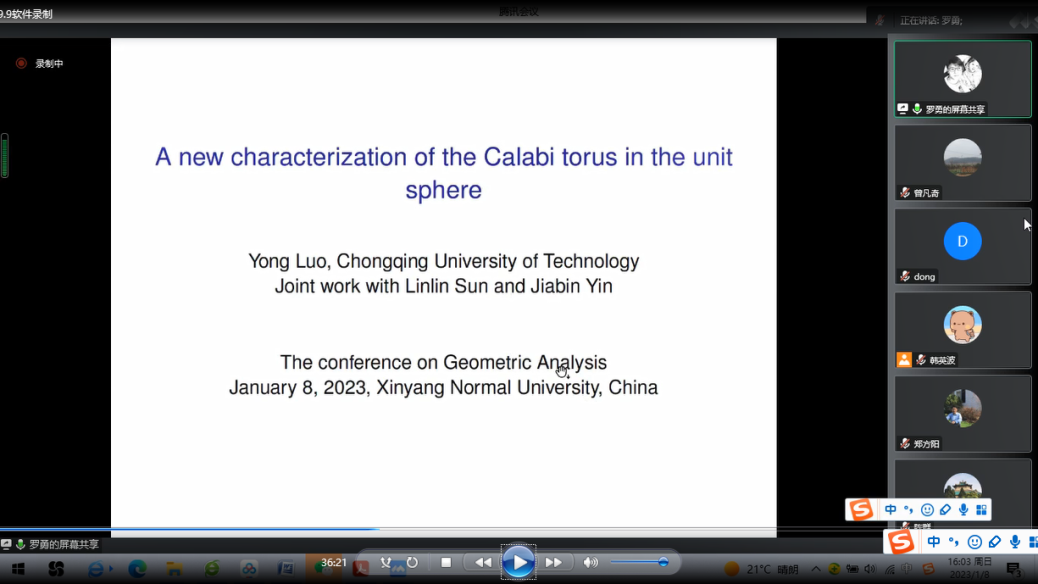 2场报告由重庆理工大学罗勇教授报告,题目为《A new characterization of the Calabi torus in the unit sphere》。在报告中,罗勇教授讨论了单位球面中闭的极小Legendrian子流形的拼挤结果。得到了单位球中的Calabi环面的一个新的刻画。