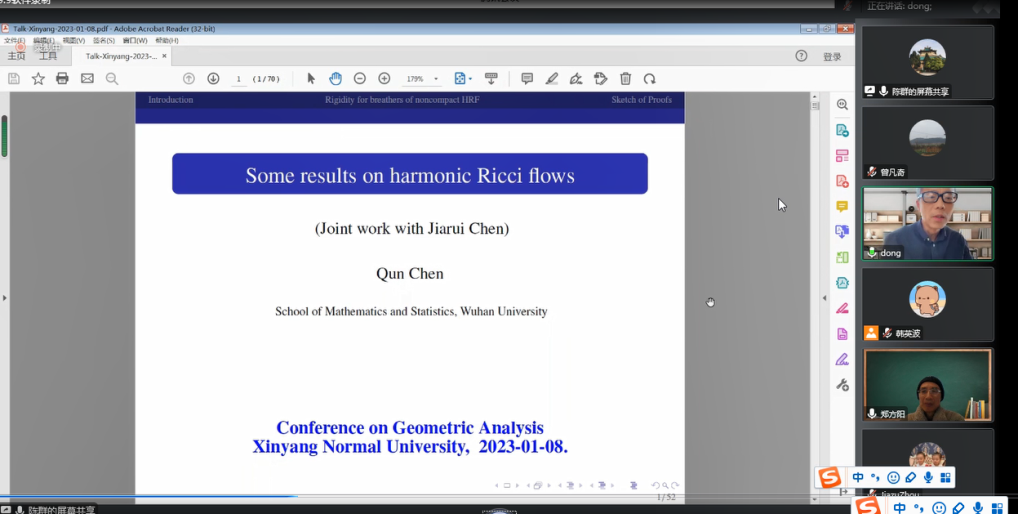 1场报告由武汉大学陈群教授报告,题目为《Some results on harmonic Ricci flows》。在报告中,陈群教授讨论了在不同几何条件下调和Ricci的周期解的刚性结果。