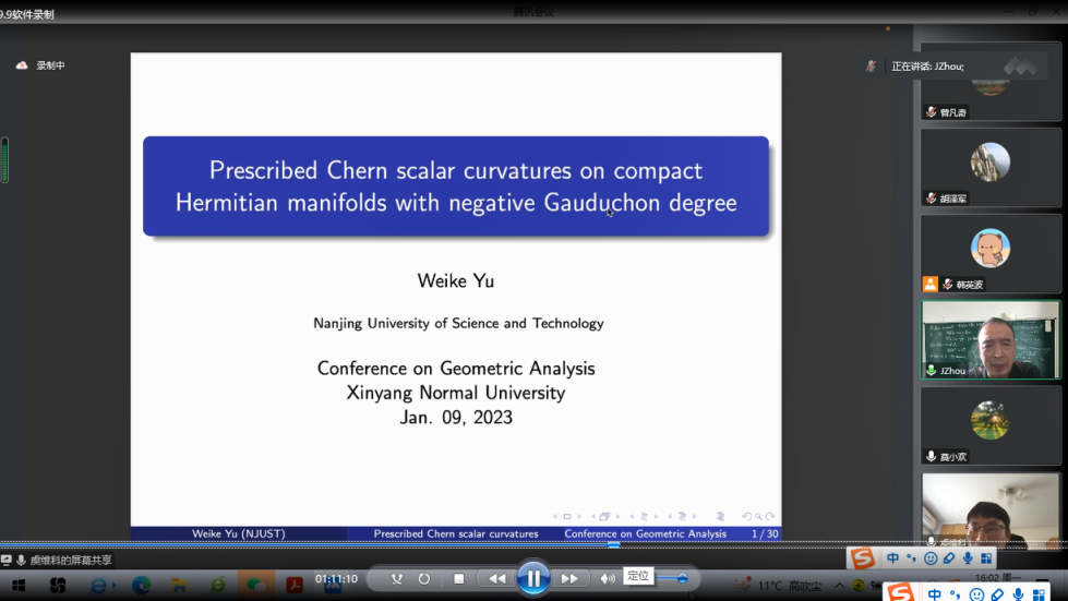 第2场报告由南京理工大学虞维科教授报告,题目为《Prescribed Chern scalar curvatures on compact Hermitian manifolds with negative Gauduchon degree》。在报告中,虞维科教授讨论了具有负Gauduchon度的紧致Hermitian流形上的预定Chern数量曲率问题。