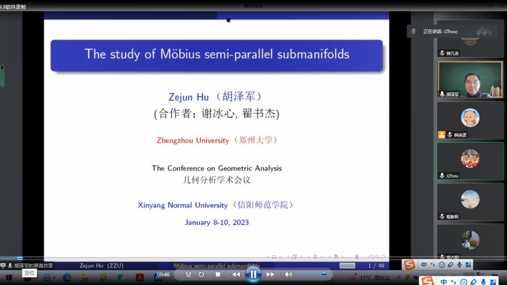 第1场报告由郑州大学胡泽军教授报告,题目为《The study of Moebius semi-parallel submanifolds》。在报告中,胡泽军教授讨论了n+p维单位球面上的n维Moebius 半平行子流形的几何性质。