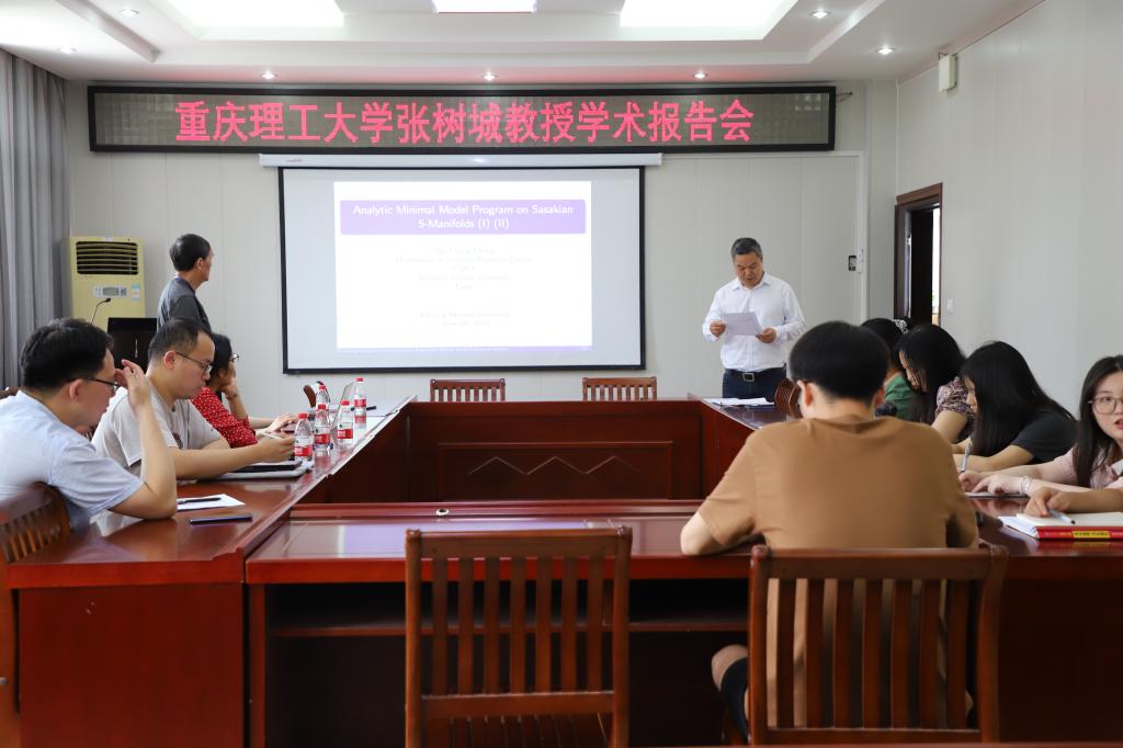 6月14日下午,应永利23411集团邀请,重庆理工大学张树城教授在公司报告厅作了题为“Analytic Minimal Model Program in a Sasakian Five-Manifold”的报告。报告会由永利23411集团副经理韩英波教授主持,几何学团队教师和研究生参加了此次报告会。