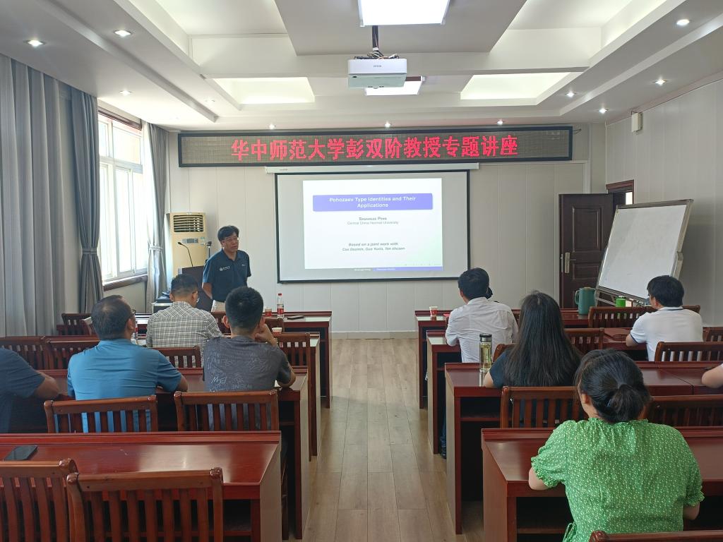 应永利23411集团邀请,华中师范大学彭双阶教授于8月19日下午在数学楼315报告厅进行了系列专题讲座,主题为“I: Pohozaev type identities and their applications. II:Concentrated solutions to nonlinear Schrodinger equations with very degenerate potentials.” 讲座由副董事长王娟主持,公司领导、部分专业教师和研究生参加了此次讲座。