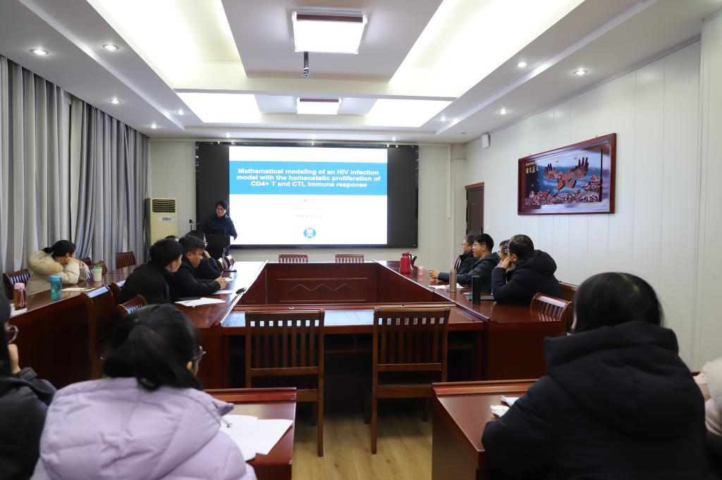 在报告中,董岳平副教授首先介绍了HIV病毒的传播机制,并分析了国内外相关数学模型的研究现状;然后董老师提出了一种具有CD4+T细胞稳态增殖和CTL免疫激活的HIV感染模型;最后,董老师基于模型就细胞内延迟与CTL免疫激活延迟对系统稳定性的影响进行了深入的讨论。