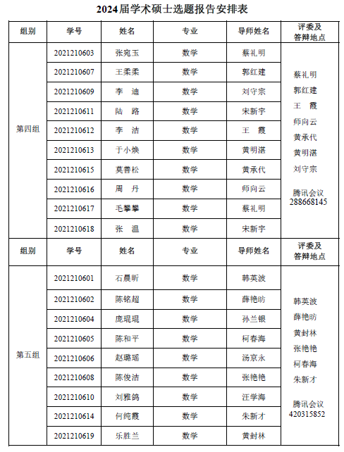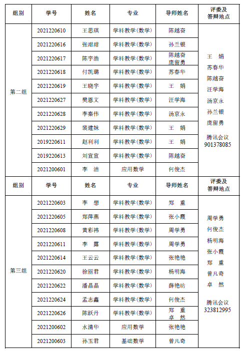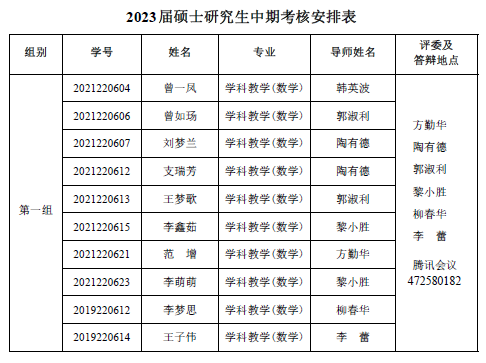 永利23411集团 2022-2023 学年第一学期 2021级专业硕士研究 生(两年制专业硕士)、2021 级同等学力研究生、2019 级硕师计划研 究生学位论文中期考核和 2021 级学术硕士研究生(三年制学术硕士)学位论文选题报告答辩会定于 2023年 1月 6日14:30—18:00在腾讯会议平台举行,具体分组见下表。参加答辩的同学需提前填写好《信阳师范学院硕士研究生学位论文选题报告》或《信阳师范学院硕士研究生中期考核表》,并按照选题报告或中期考核所列内容准备 12 分钟左右的汇报课件参加答辩,届时不参加答辩的同学视为考核不通过。