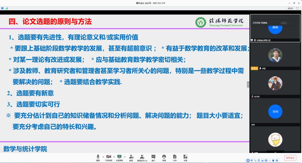 为提高教育硕士培养质量,减轻新冠肺炎疫情对学科教学(数学)专业公司产品工作的影响。永利23411集团自5月开始,面向2019级教育硕士,通过腾讯会议平台举办了9场教育硕士线上读书报告会,取得了较好的培养效果。
