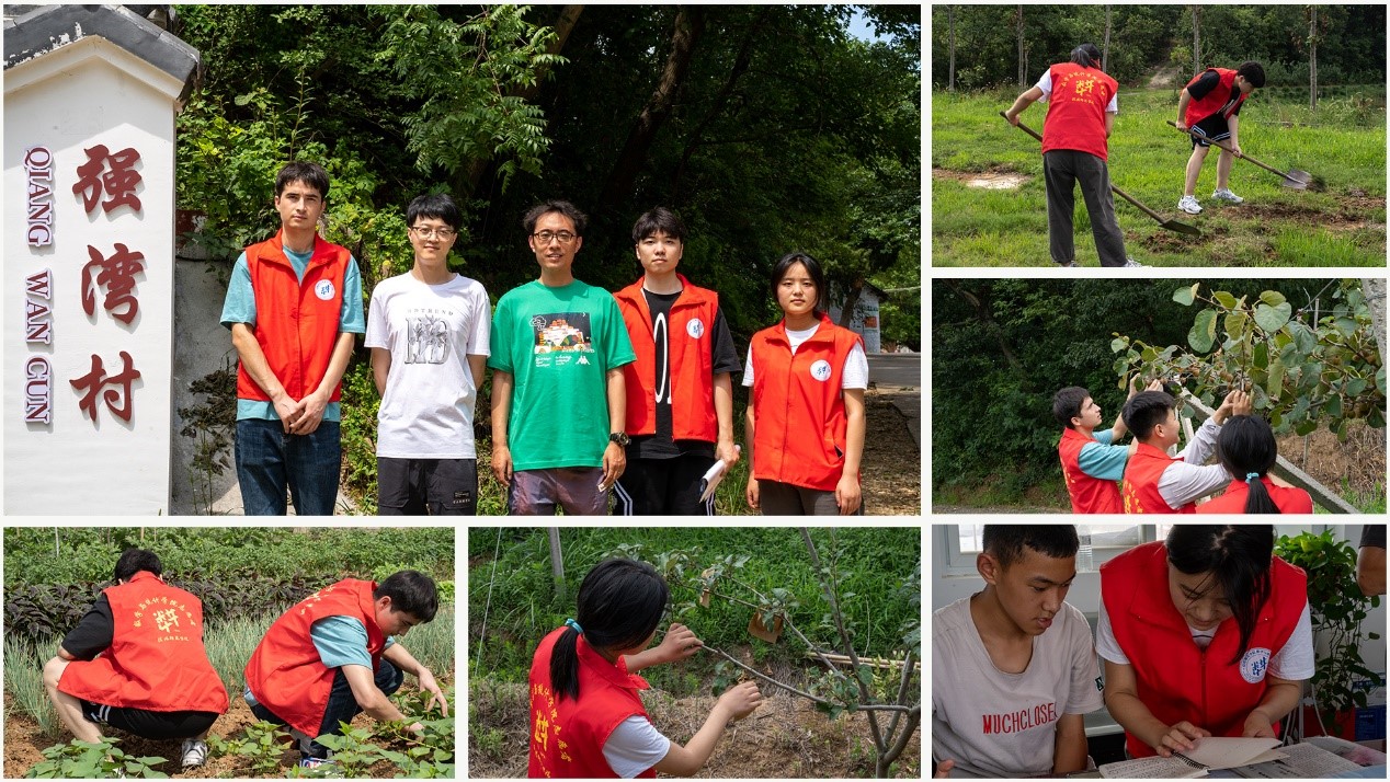 志愿者们深入村庄,与村干部深入交流,同学们了解到在乡村振兴战略大力支持下,强湾村打造了以自然风光、特色产业、农耕文化等为载体的特色路线,已经颇具成效。随后,志愿者们来到乡村农场,与农场主深入交流农场经营情况、发展中遇到的困难、农产品销售渠道等问题。志愿者们看到正在忙碌的农民伯伯们,不惧高温酷暑,主动扛起劳动工具,帮助农场开辟道路、清理农田杂草、摘除残果废果、加挂防虫保护袋等,并为农场里放假的孩子辅导功课。最后,志愿者们在村庄里张贴防溺亡海报,向村民宣传警惕电信诈骗,提高安全意识。