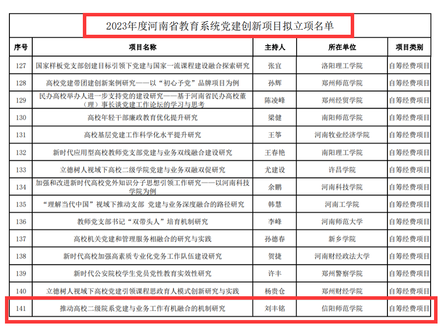 近日,河南省委教育工委、河南省教育厅下发了《关于下达2023年度河南省教育系统党建创新项目计划立项的通知》,永利23411集团申报的党建创新项目《推动高校二级院系党建与业务工作有机融合的机制研究》获批立项。