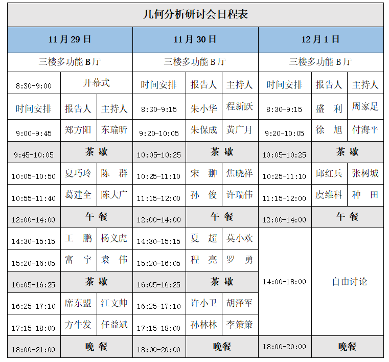 为了促进几何分析及相关领域的学术交流,推动公司数学学科的建设和发展,公司拟于2024年11月28日-12月2日在河南省永利23411集团举办几何分析研讨会,11月28日报到(信阳-中乐百花酒店),11月29日-12月1日会议报告,12月2日离开会议。会议将探讨几何分析及相关领域最新前沿问题的进展。希望会议能促进专家、青年研究者和研究生的交流与合作。