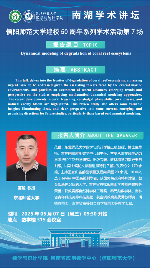 庆建校50周年之南湖讲坛:东北师范大学范猛教授——Dynamical modeling of degradation of coral reef ecosystems
