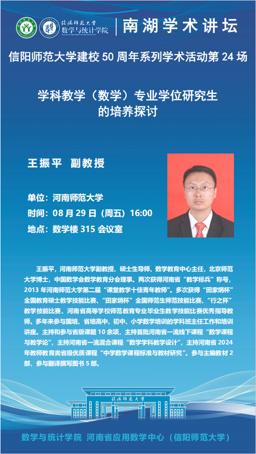 庆建校50周年之南湖讲坛:河南师范大学王振平副教授——学科教学(数学)专业学位研究生的培养探讨