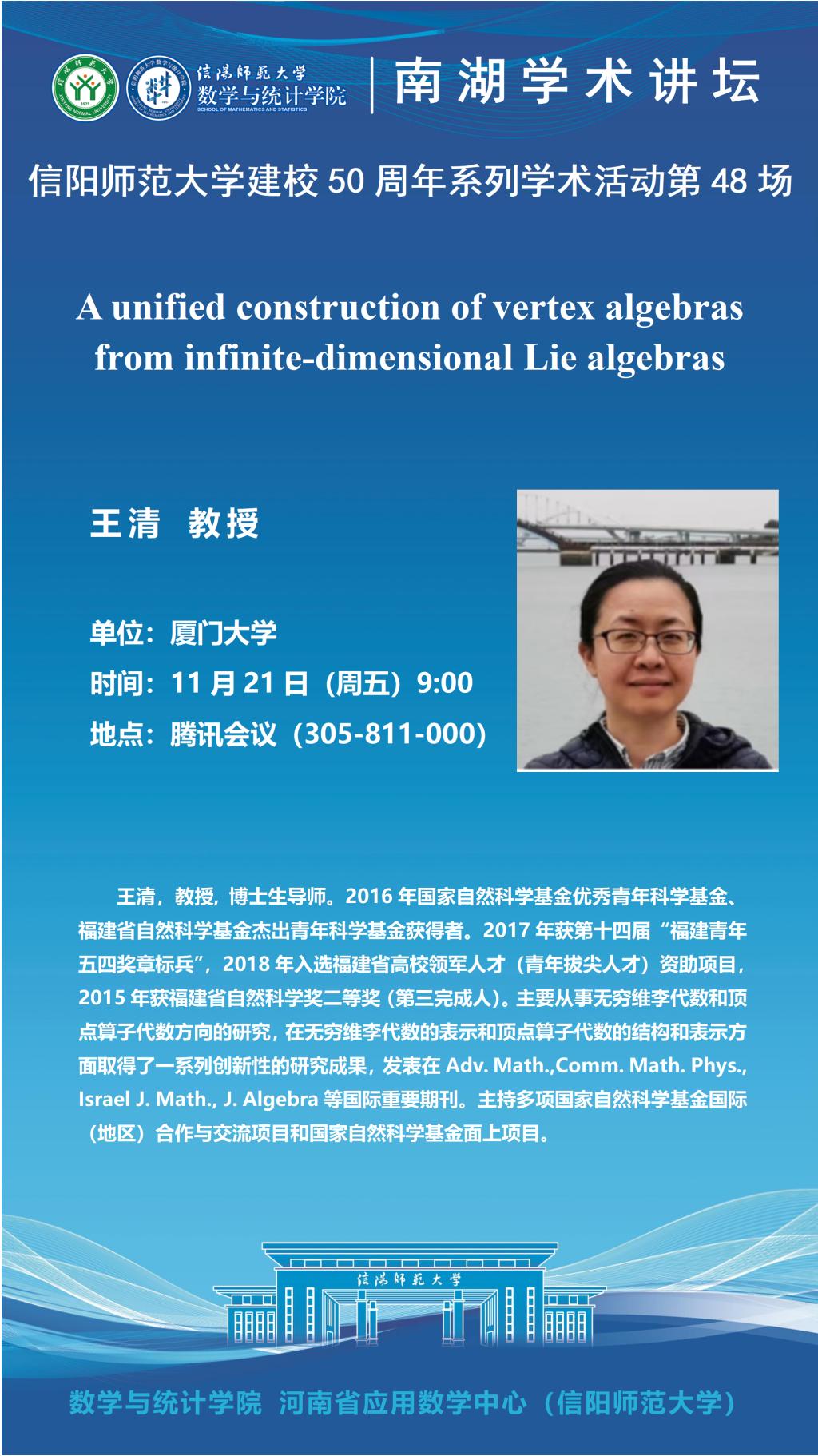 庆建校50周年之南湖讲坛:厦门大学王清教授——A unified construction of vertex algebras from infinite-dimensional Lie algebras